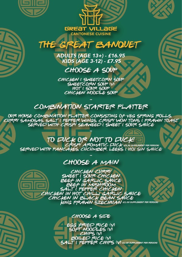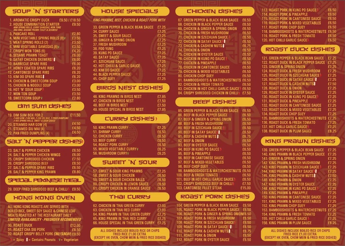 The menu features a variety of Chinese cuisine options suitable for both dine-in and takeaway. It is primarily organized around traditional Chinese main courses and accompanies with a selection of desserts. Popular categories include spare ribs, noodle dishes such as chow mein, and other meat options like beef and duck, with gluten-free choices clearly available. Dessert offerings include items like lemon sorbet, providing a lighter finish to the meal.